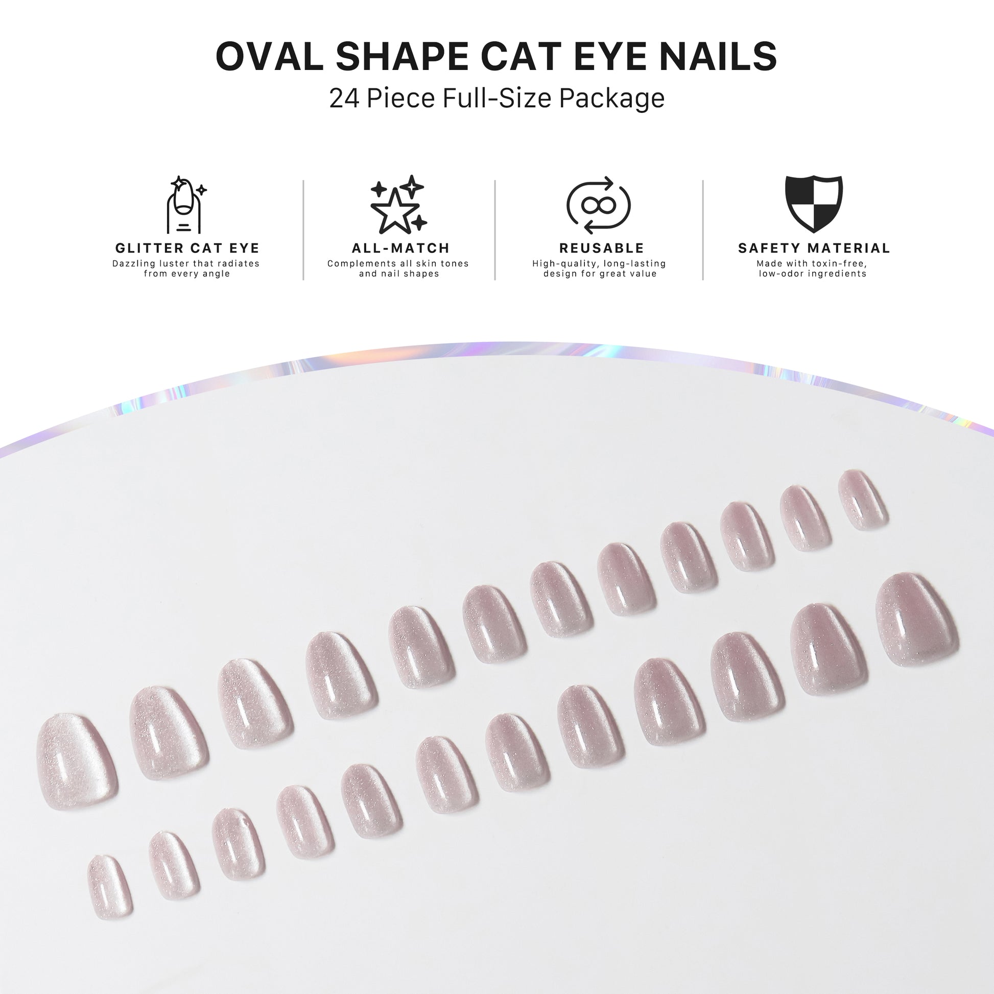 Velvet Sparkling Cateye Press On Short Nails in Oval shape deliver instant glamour with a luxurious, sophisticated look. The striking cateye design transitions seamlessly from everyday wear to special occasions. These short oval nails flatter all hand shapes and apply effortlessly with included adhesive tabs or nail glue—no salon visit needed. Each set includes multiple sizes for a perfect fit on every finger. Durable and reusable, they maintain their rich velvet finish and sparkle through repeated wear. Remove gently whenever you want a fresh look. Get salon-quality results in minutes with this eye-catching design.