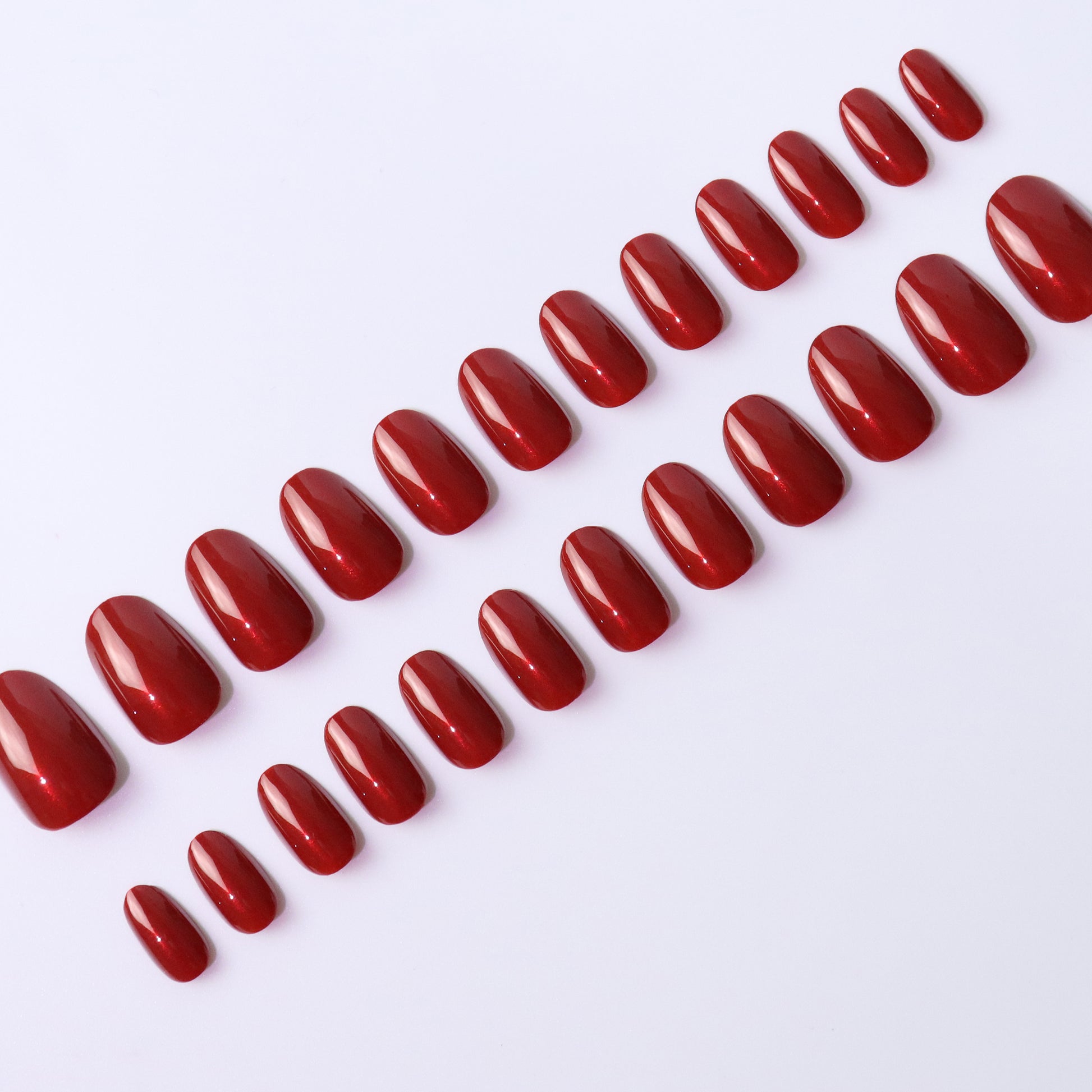 Elevate your nail game with these stunning Ruby Red press-on nails. This 24-piece set features a luxurious gel polish finish with a high-gloss shine that catches the light beautifully. Each nail is crafted from durable ABS plastic in a flattering oval shape, sized perfectly for medium fingers.